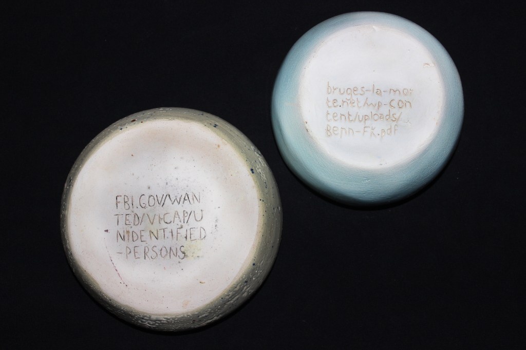 Depuis quelques années, je collectionne des liens internet de toutes sortes ; ma sélection est guidée par mes centres d’intérêt et l’étrangeté du contenu. Il y a bien sûr les classiques forums fétichistes désertés depuis 2005, et des liens au contenu abscons. Ces espaces fluctuants qui composent internet sont comme, selon moi, un accès tout droit à l’inconscient, où n’importe qui peut exprimer ses tendances. Comment pouvais-je partager ce modeste bagage ? Comment transmettre ? Il m’a semblé qu’il était pertinent de graver quelque chose d’aussi récent et éphémère que des liens internet sur un des médium le plus ancien et le plus stable à l’échelle de l’humanité. La singularité des bols en céramique obtenus n’est volontairement pas dans leur forme ; ils pourraient trouver facilement leur place dans une cuisine, dans une boutique d’occasion. Ils n’éveillent aucune méfiance, et leur valeur repose dans ce secret gravé qui leur est propre.