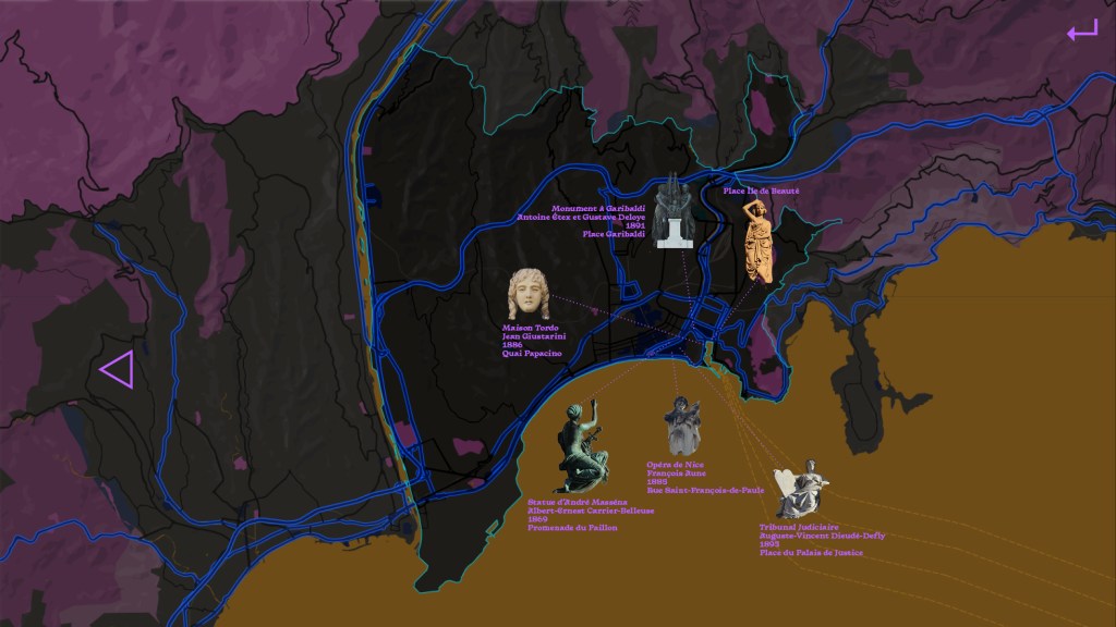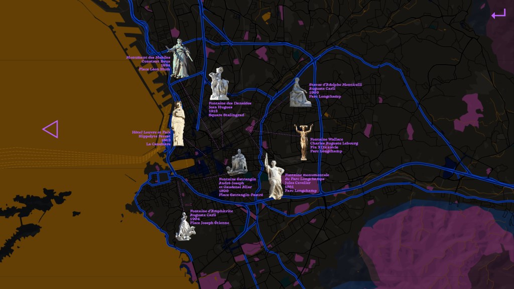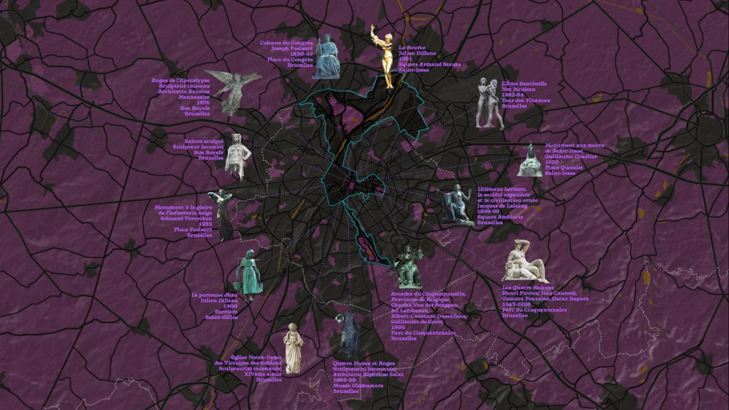 Ce projet est une balade virtuelle autour des statues de femmes dans l’espace public. Ce ne sont pas les rares statues de femmes illustres qui m’intéressent ici, mais les anges de rebut que l’homme minuscule s’est permis de reprendre et finir selon ce qui l’a arrangé. Ce sont les innombrables archétypes, allégories, stéréotypes, et autres figures génériques qui peuplent les jardins publics, les institutions, bâtiments et lieux de pouvoir qui parsèment cette balade. Ce sont des idées de femmes, dépourvues d’individualité car réceptacles de symboles et d’idées, en ce sens idéales et abstraites. Cette promenade se présente comme une navigation où le visiteur est autonome. Il traverse des cartes et des lieux pour naviguer parmi la ville via les statues féminines.