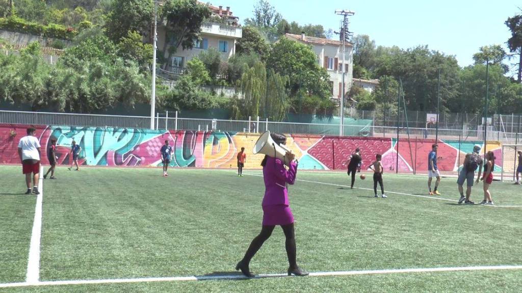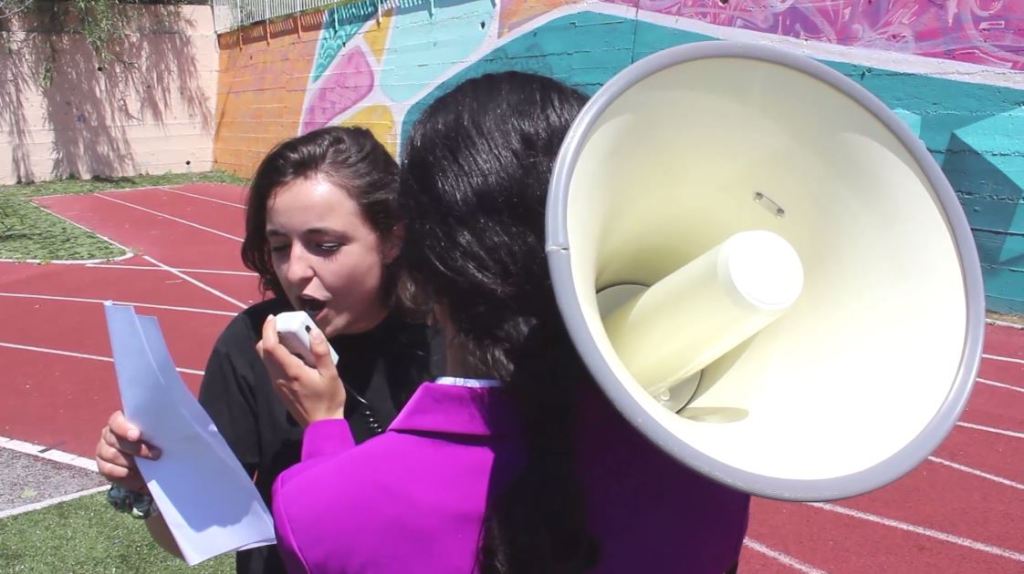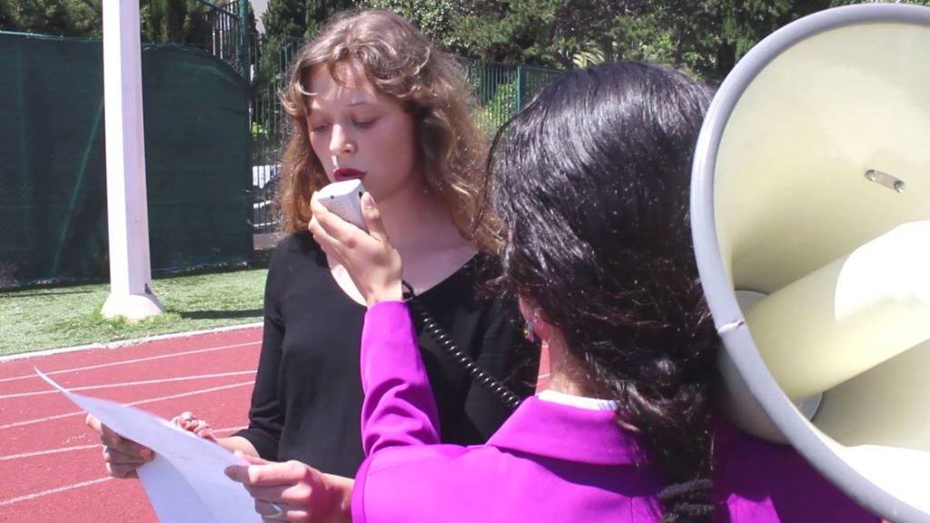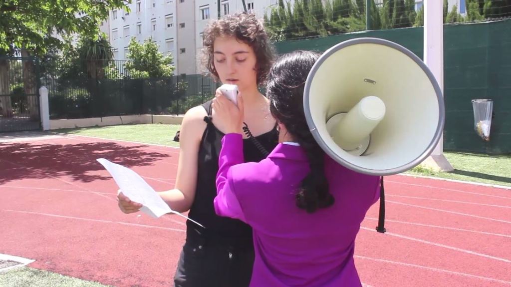 Les genoux est une performance filmée. C’est le fruit d’une recherche sur les chansons paillardes et gaillardes, et les lieux où ces chansons produisent du lien, et pour qui. Le sport et ses vestiaires est un milieu fertile en chansons paillardes et autres locker room talks. Pour cette performance, j’ai placé des cheerleaders tristes aux quatre coins du terrain de football, et longe le terrain munie d’un mégaphone pour leur faire scander mes propres poèmes et chansons, interprétations personnelles de ces chansons paillardes.