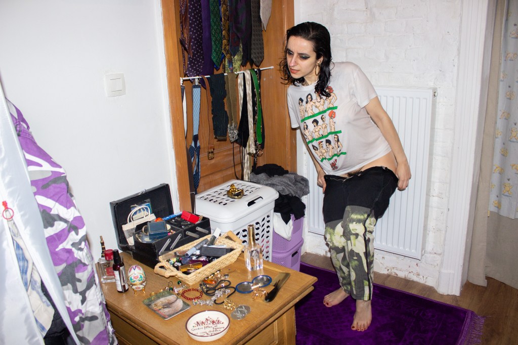 MUSOGYNIE ou les malheurs de la vertu est une série d’autoportraits plaçant en son cœur ma relation personnelle aux objets de la collection. Ils voyagent entre les lieux d’exposition et mon domicile, tantôt installation artistique, tantôt simples objets usuels participant à mon quotidien. Les objets sont disséminés dans la sphère domestique, habitée par une muse revenant d’un concours de t-shirt mouillé.